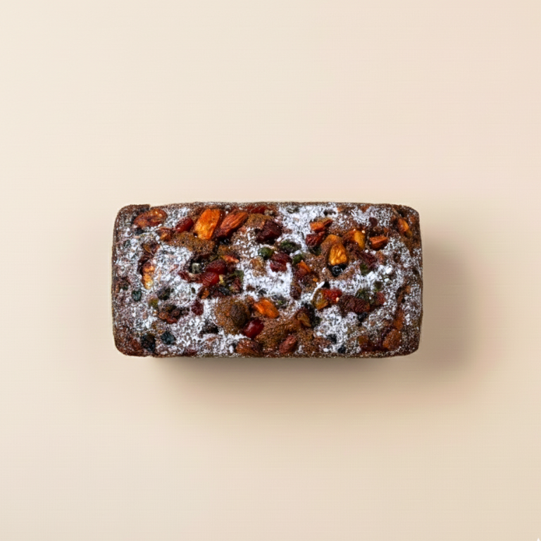 Moist, spiced plum cake packed with dried fruits (mini size).
